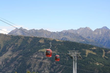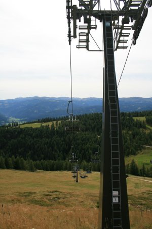 Zusammen mit den Gästen am Vormittag ein ausflug auf das Speiereck. Im Winter ist das ein hübsches touristisches Schigebiet. (recht neu: mit kleinem Campingplatz an der Talstation) Man fährt mit einer Gondel für acht Personen zuerst einmal achthundert Meter nach oben, bevor man dann zwischen den zahlreichen -für mich gruselig aussehenden -Sesselliften hin und her wechseln kann. Im Sommer ist die Gondelbahn ab und zu für Wanderer geöffnet (ist also praktisch für besitzer künstlicher Hüftgelenke). Oben gibt es ein bisschen Natur und viel Nicht-Natur, wie zum Beispiel einen Pseudobergsee aka Schneekanonenwasserspeicher.