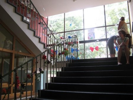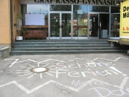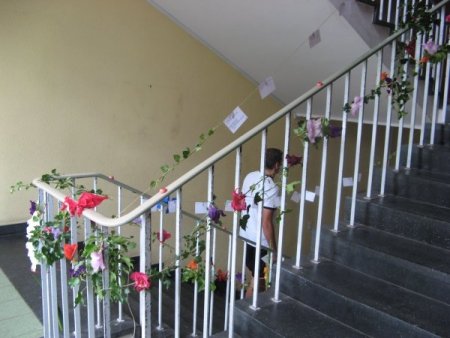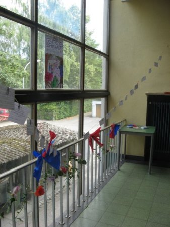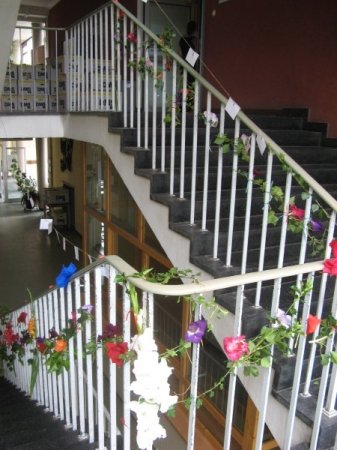Die Idee kam mir irgendwann am Montag oder Dienstag in der letzten Schulwoche. Das Treppenhaus mit Blümchen zu schmücken, das war ziemlich schnell da, Schnüre mit Karteikarten „Was werde ich an dieser Schule vermissen / nicht vermissen“ zu spannen, etwas später. Am Mittwoch habe ich dann Leute zusammengetrommelt, möglichst welche, die am Donnerstag in dasselbe Projekt eingeteilt waren wie ich. Eine Schülerin schlug noch Straßenkreiden vor, also gab es auch noch Straßenkreide. (Hatte ich auch schon daran gedacht – aber ich wollte niemanden überfordern)