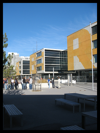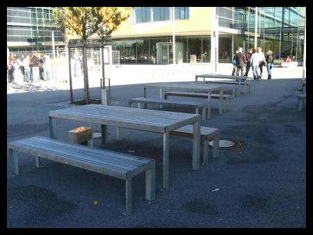 Ausstattung des Pausenhofes. Vor der Mensa (natürlich).