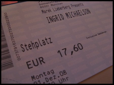 Meine Karte für Ingrid Michaelson im Dezember, die da für drei Tage und drei Konzerte nach Deutschland fliegt. Das war zumindest die Theorie. Jetzt ist das Konzert in München abgesagt, die Karte darf sich zurück schicken lassen. Meine Begleitperson Resi ...