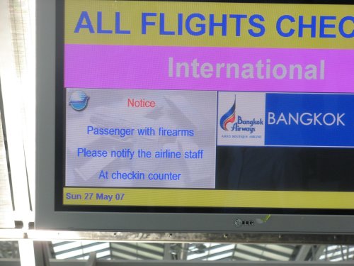 Das Erbe von "No Liquids". In Bangkok wird erst am Gate das Handgepäck kontrolliert. Und kontrolliert bedeutet in den meisten Fällen zuerst durchwühlt und dann durchleuchtet. Ich hatte Glück, ich wurde nur gefragt, ob ich liquids hätte. Ich hatte zwar keine, aber das war wieder so eine typische Sicherheitskontrolleurfrage, die man sich im Prinzip gleich sparen hätte können.