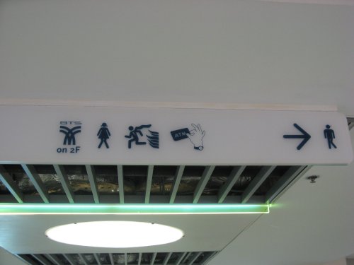 Das ist der Eingang zum Siam Center. In Thailand müssen übrigens nicht nur Schüler, sondern auch Stundenten Uniformen tragen. Die Studentenuniformen bestehen aus einer schwarzen Hose und weißem Hemd beziehungsweise schwarzem Rock und weißer Bluse. Schuluniformen hingegen sind von Schule zu Schule verschieden, meistens farbig und oft hässlicher. (Weite T-Shirts und Hosen bzw. Röcke in seltsamer Länge.)
