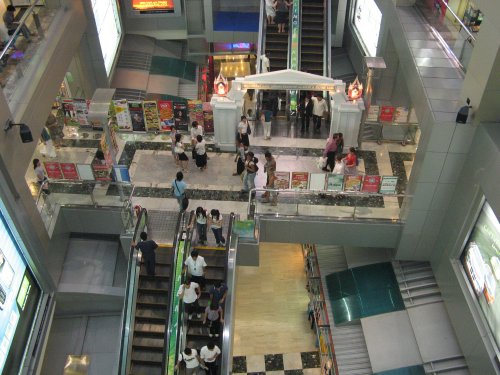 Das MBk, ein Einkaufszentrum in der Nähe des Siam Squares, das auch bei Thailänders sehr beliebt ist. man findet dort alles mögliche. in den untereren Stockwerken gibt es durchaus Markenartikel, sowie auch im Tokyu (japanische Kaufhaus). je weiter man nach oben kommt, desto .. selbst gemachter wird das Angebot. Ganz oben findet man zum Beispiel traditionelle Thaidinge, also Seide, Sarongs, Holzelefanten und Buddhabilder sowie viele andere selbst gefertigte thailändische Produkte, die auch einmal näher an Westliches heraanreichen.
