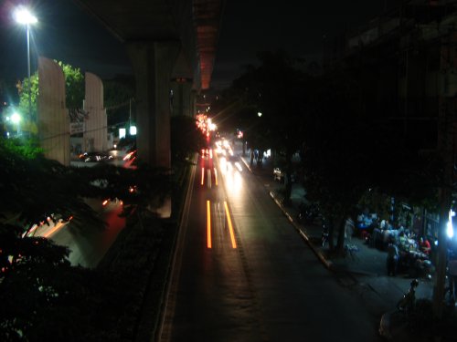 Die Sukhumvit Road, insgesamt 400km lang und die größte Straße. Über der Sukhumvit verläuft die gleichnamige Sky Train Linie. die Straße hat über hundert Nebenstraßen, die so genannten Sois, die nur durchnummeriert werden. Die Adresse unseres Hotel war zum Beispiel "Sukhumvit Soi 33", also in der 33. Nebenstraße.