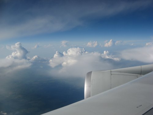 Wolken, schon kurz vor Frankfurt. Man muss sich ja unterhalten. Bis kurz vor Frankfurt musste man nämlich die Blenden unter lassen.